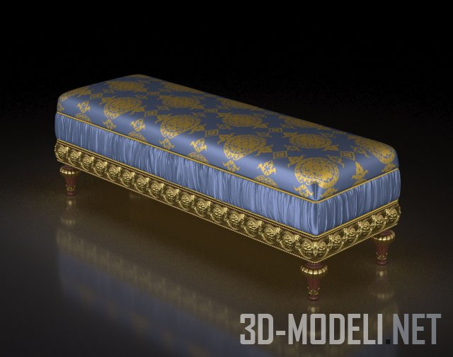 Небольшая кушетка в классическом стиле от итальянской фабрики Modenese Gastone. Кушетка обтянута синим шелком с золотым дамасским узором, декорирована богатой резной деревянной инкрустацией золотого цвета по периметру и оснащена небольшими резными ножками.