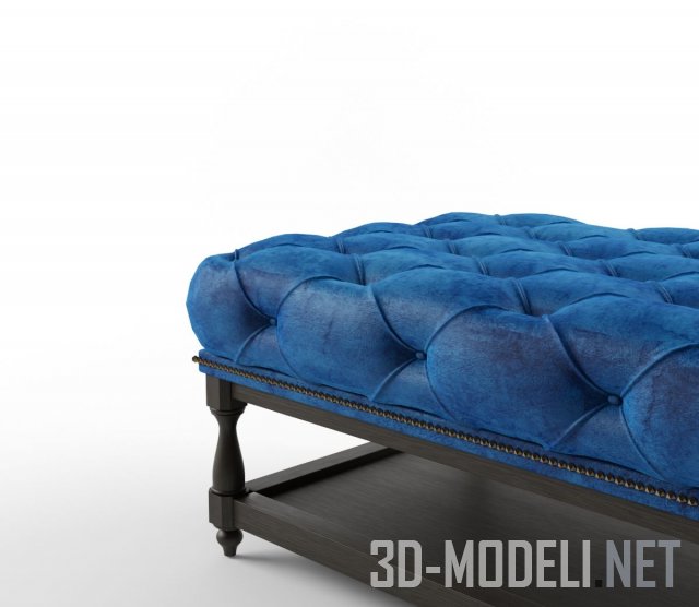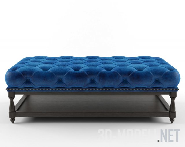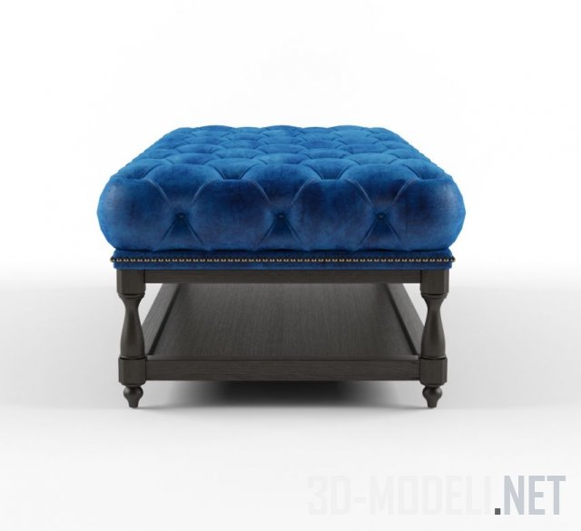Оригинальный симбиоз пуфа и журнального стола в стилистике Chesterfield. На плоской прямоугольной поверхности лежит стеганый пуф с обивкой красивого синего цвета. Под пуфом внизу у самого пола большая полка, на которую можно поставить чашку или положить книгу сидя.
