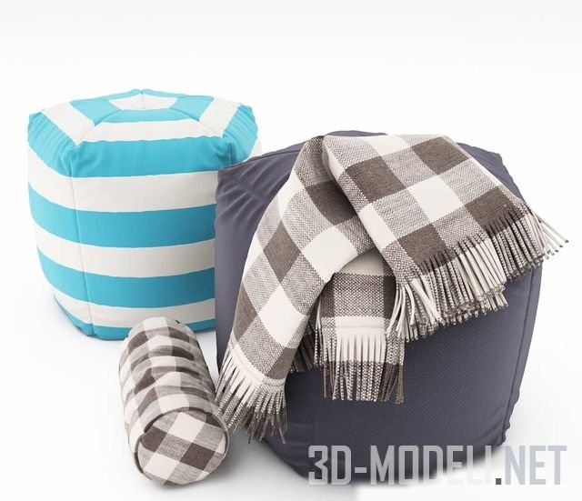 Два мягких пуфа пятигранной форы, обтянутых серой тканью и в бирюзово-белую полоску. На сером пуфе лежит небольшой бело-коричневый плед в крупную клетку с бахромой. Рядом с пуфом лежит валик, обтянутый такой же клетчатой тканью.