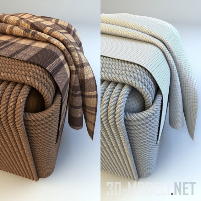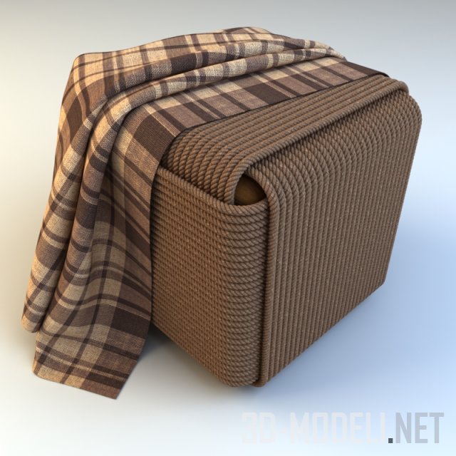 Оригинальный пуфик в форме куба, сделанный из пеньковой веревки коричневого цвета. Его размер: 455 Х 455 Х 455 мм. На пуфике сверху лежит мягкий плед в крупную коричневую клетку.