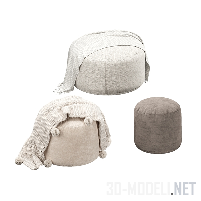 Три пуфа с текстильной обивкой светло-серого, бледно-коричневого и цвета слоновой кости. Пуфы разного диаметра. Пара покрывал на пуфах (вязаное Virka, цвета слоновой кости, с меховыми помпонами и текстильное, с бахромой по двух сторонам, с мелкой елочкой бело-серого цвета).