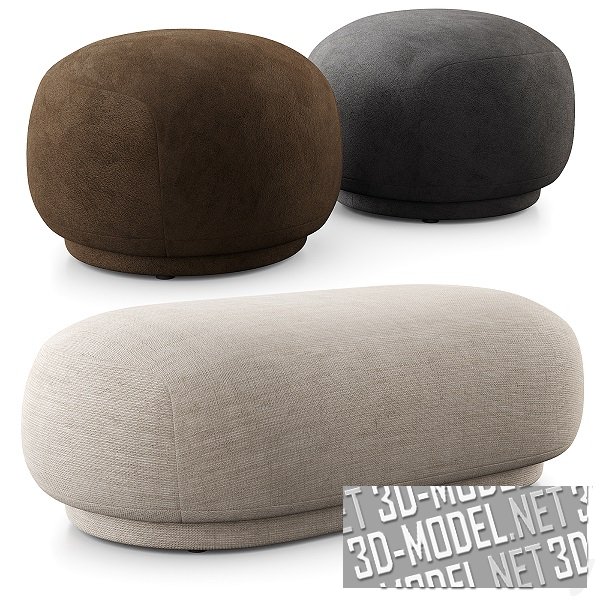 Современные пуфы и оттоманка Rico от датчан из Ferm Living, с обивкой из текстиля. Стремящиеся к шарам пуфы имеют габарит: 60х60х41см. Обивки: песочная с текстурой холста и коричневая велюровая. Овальная оттоманка обита темно-серым велюром. Ее габарит: 41х124х69см.