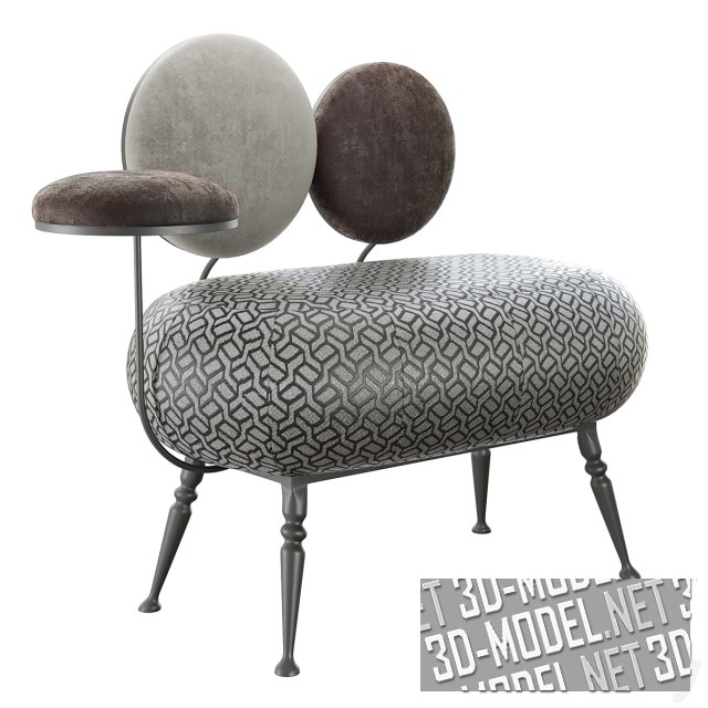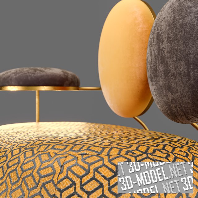 Необычная банкетка со спинкой и подлокотником в виде круглых элементов с мягкой обивкой. Банкетка в трех вариантах цвета: белый, серый и золотисто-шоколадный. Золотистый металл фигурных ножек и каркаса спинки отлично гармонирует с любым из вариантов.