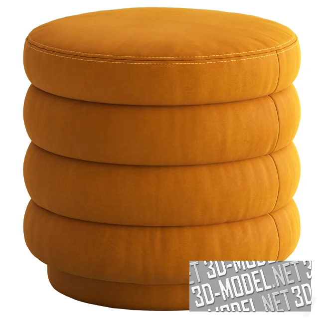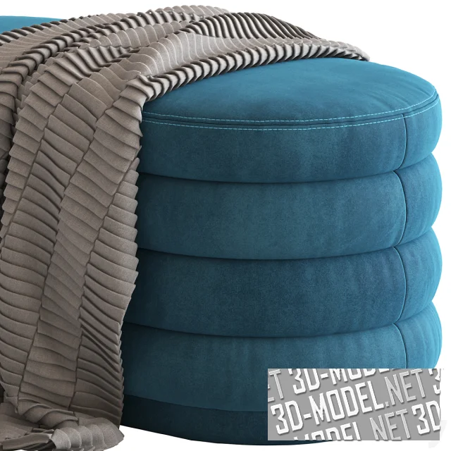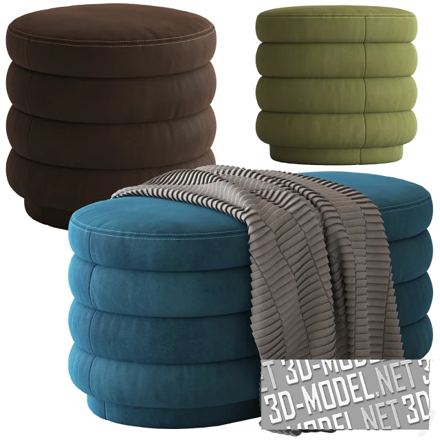Две модели мягких оттоманок Globewest Ribbed - круглая (d37/h45) и овальная (88х45х45см). Пуфы выполнены с текстильной обивкой (золотисто-желтый, оливково-зеленый, синий, темно-коричневый цвет), в виде четырех слоев мягких скругленных подушек. На овальный пуф наброшен плед из плиссированых серых полос.