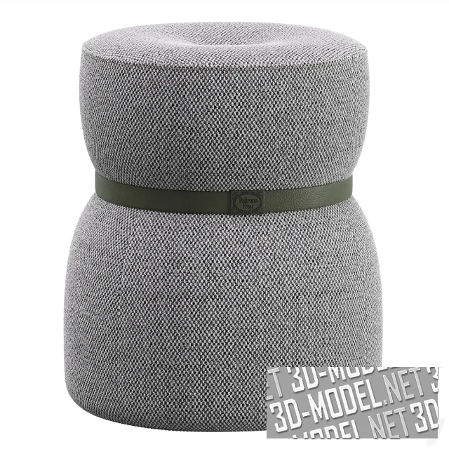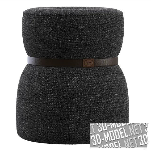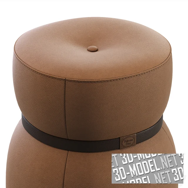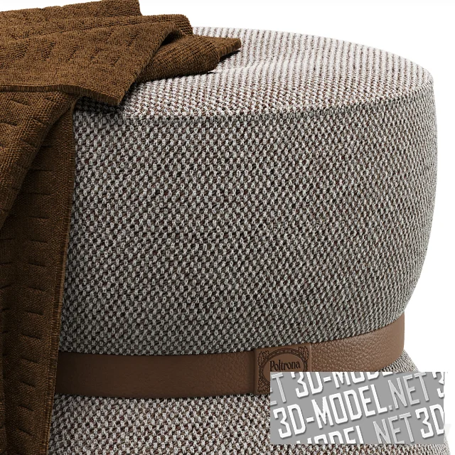 Цилиндрический, перетянутый кожаным ремнем мягкий пуф LEPLI от Poltrona Frau. В центре круглого мягкого сиденья выполнена втяжка с круглой пуговицей. Обивка пуфа представлена в четырех вариантах: карамельная кожа, коричнево-белый и серо-белый текстиль с мелкой текстурой, черный текстиль. Кожаный ремень в трех вариантах: болотно-зеленый, светло- и темно-коричневый. На пуф наброшен коричневый плед.