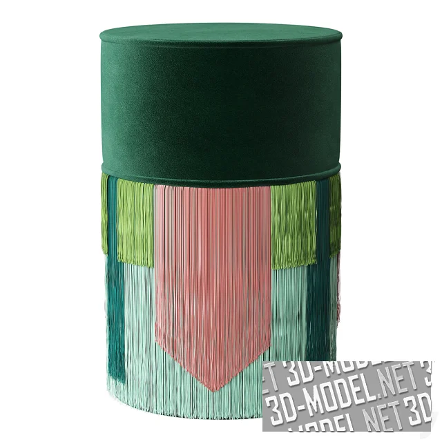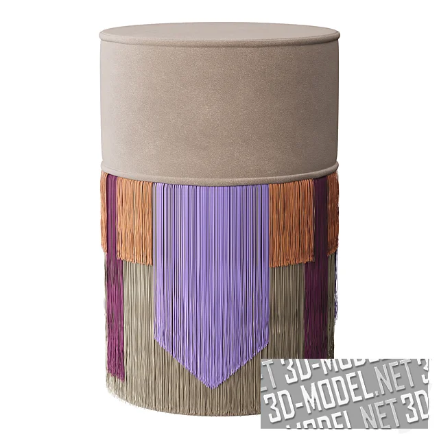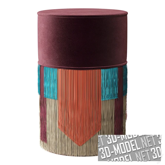 Современные круглые пуфы COUTURE GEOMETRIC TIE от Lorenza Bozzoli Couture. Характерным элементом коллекции выступает длинная цветная бахрома, от нижней кромки подушки сиденья до пола. Бахрома состоит из нескольких слоев разного цвета и формы и складывается в несложный геометрический орнамент. Сами сиденья обиты велюром в трех вариантах цвета: бежевого, бордового, темно-зеленого. Габарит пуфа - d30/h46см.