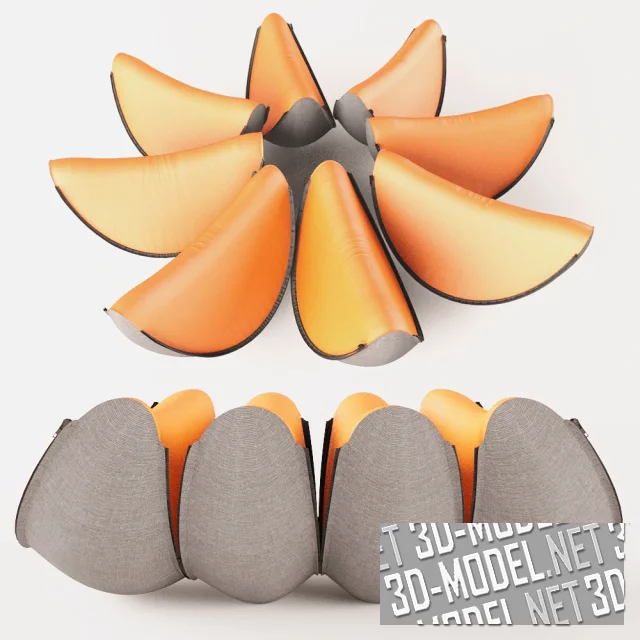 Оригинальный мягкий пуф, собранный из восьми мягких долек (из вспененного полиуретана, обтянутого текстилем), соединяемых молниями. Наружные плоскости обтянуты серым льняным холстом. Внутренние - гладким оранжевым текстилем.