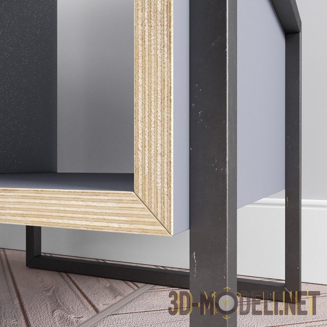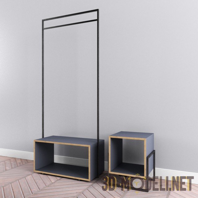 Современная система для гардеробной. Включает в себя вешалку, сваренную из черной металлической профильной трубы, с расположенной снизу открытой тумбой и небольшую квадратную тумбу на сварном каркасе чёрного цвета. Корпуса тумб собраны из плит с серыми плоскостями, соединёнными срезами под сорок пять градусов и кромкой в виде слоистой фанеры.