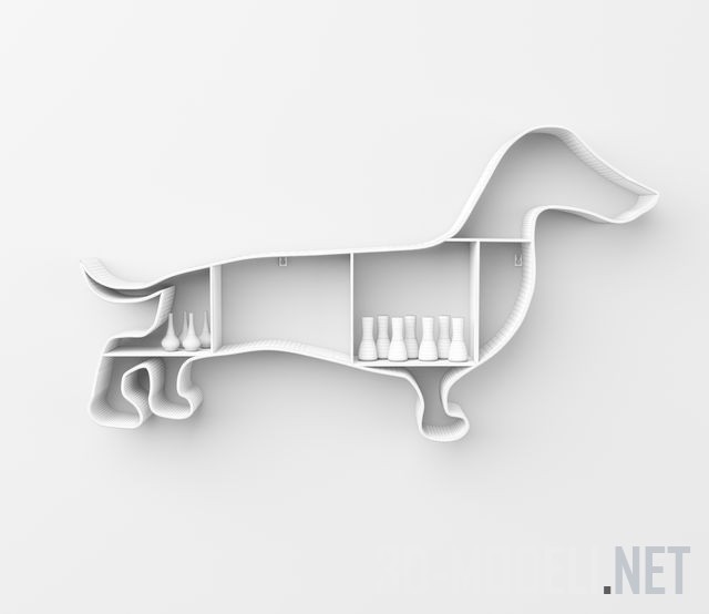 Забавная полочка из неширокой металлической полосы, согнутой в виде контура таксы. Фигурка собаки выполнена достаточно реалистично: длинное туловище на коротких ножках, веселый хвостик и характерная форма головы. Внутри фигуры несколько вертикальных плоскостей, которые делят полку на отдельные части. На полке стоят разноцветные флакончики лака для ногтей. Размер полки: 76 х 42 х 10 см.