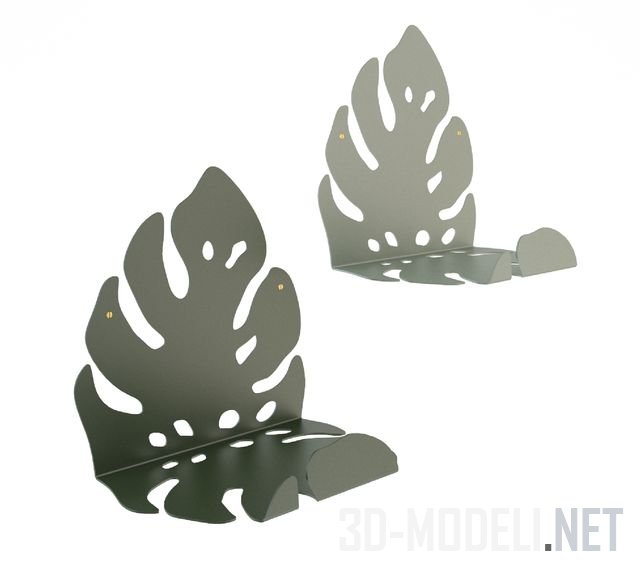 Очень оригинальные небольшие настенные полочки Dewy (что в переводе с английского означает освежающий, увлажненный). Комплект состоит из двух штук. Полки зеленого цвета, выполнены в виде согнутого листа тропического растения монстеры.