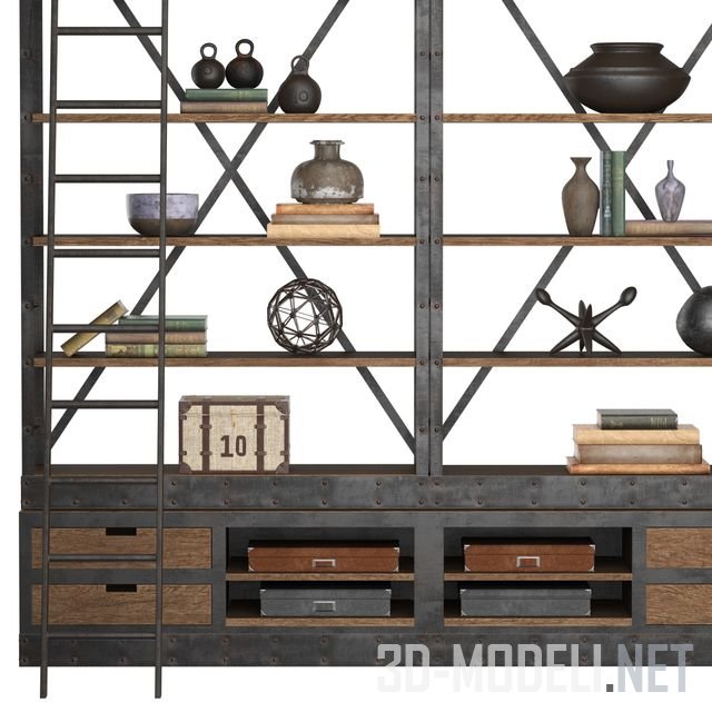 3D модель стеллажа для интерьера в стиле лофт, Industrial Iron От Loft Concept. Стеллаж наполнен различными декоративными элементами (книги, чашки, миски, кувшин и пр.), есть лестница. Стеллаж поможет создать индустриальный налет в интерьере. Размеры мебели: 213 х 38 х 237 см.