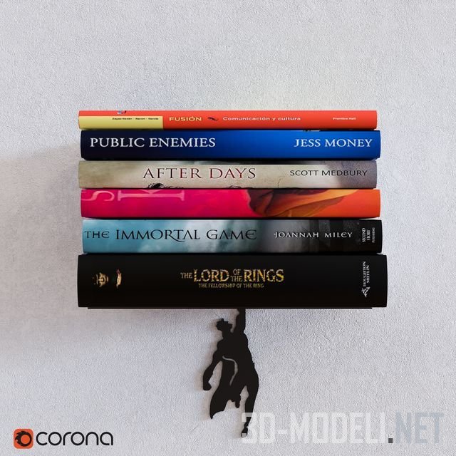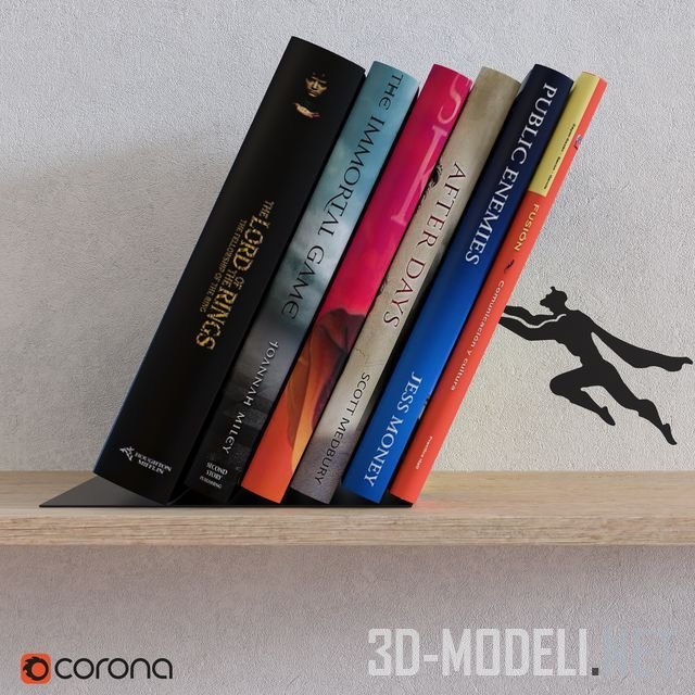 Забавная небольшая книжная полка с книгами и фигуркой Супермена, которая как бы держит эти книги, не давая им упасть.