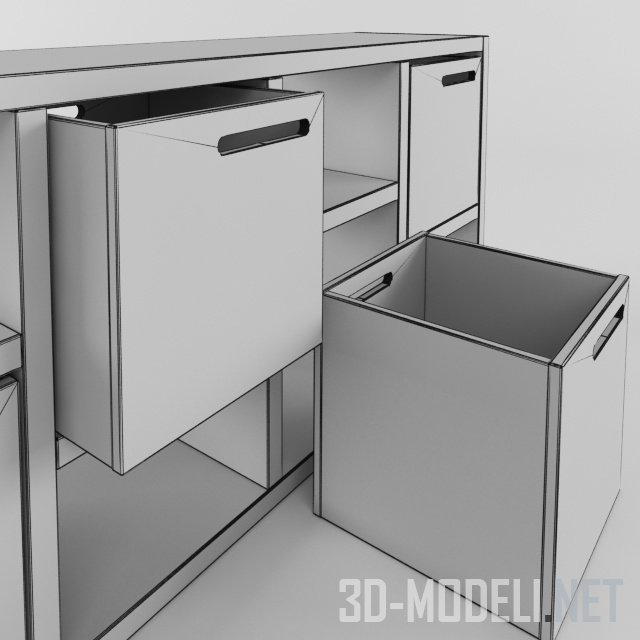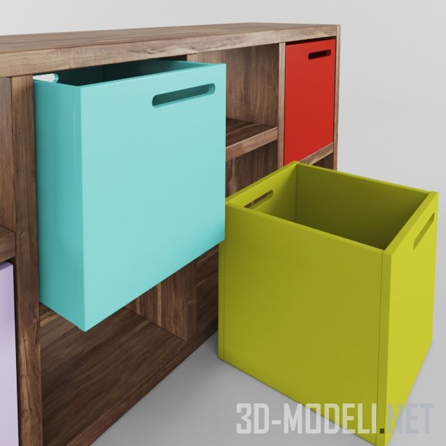 Невысокий стеллаж от португальской мебельной фирмы Temahome. Сделан из коричневого дерева с книжными полками (35 x 157 x 67 см) и выдвижными ящиками (34 x 34 x 34 см). Элементы голубого, розового, салатового и красного цвета.