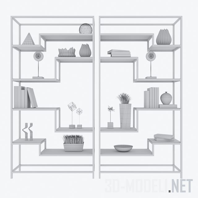 Высокий стеллаж с абсолютно симметричным расположением полок, что дает интересный геометрический рисунок. На полках стоят книги, вазы, подсвечники и книги.