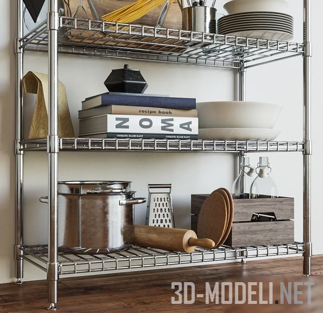 Невысокий кухонный металлический секционный стеллаж серии ОМАР от IKEA. Стеллаж с тремя решетчатыми металлическими полками. На полках лежат книги с рецептами блюд, стоит казан с крышкой SENIOR, банки с крышкой и бутылки с пробкой CORKEN, ящик Knuglyg и миска VARDAGEN.