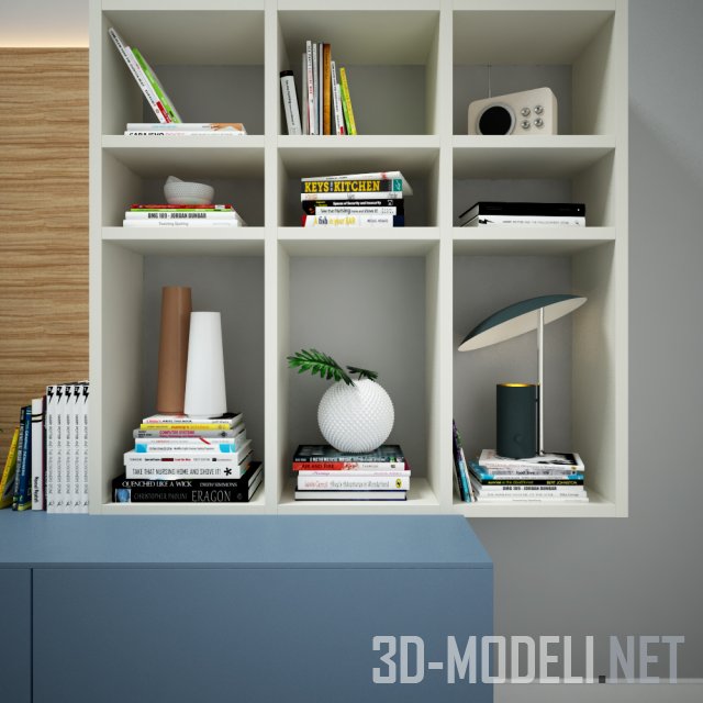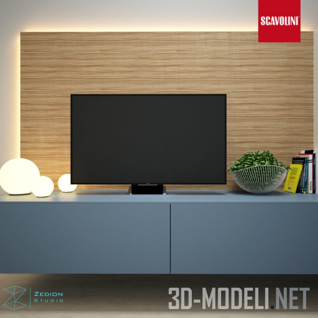 Полноценный комплект мебели и аксессуаров для формирования зоны просмотра телевизора – мебельный набор Fluid F от Scavolini. Тумба сложного цвета отлично гармонирует с деревянной панелью за телевизором и светлыми полками. Декоративные элементы (вазы, книги, картины и пр.) вносят свою долю достоверности и реализма.