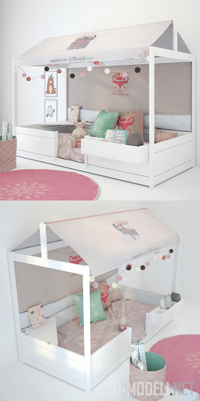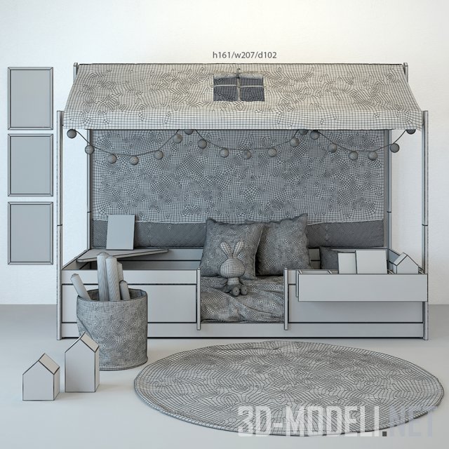 Набор мебели и аксессуаров для детской комнаты – место для отдыха, с подушками, матрасиком, столиком и навесом с окошком. Игрушки, картины, розовый коврик и пр. создают атмосферу беззаботного детства и озорства.