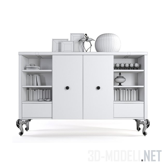 Стенка Dolfi Sofa Factory FD Collection для скрытого размещения телевизора. Невысокий белый шкаф в классическом стиле, с резными ножками и золотистыми ручками оборудован двумя раздвижными створками, за которыми и размещается телевизор. Правая и левая секции оборудованы книжными полками. На верхней плоскости шкафа размещены несколько фоторамок, фигурки фламинго и золотистая шарообразная ваза.