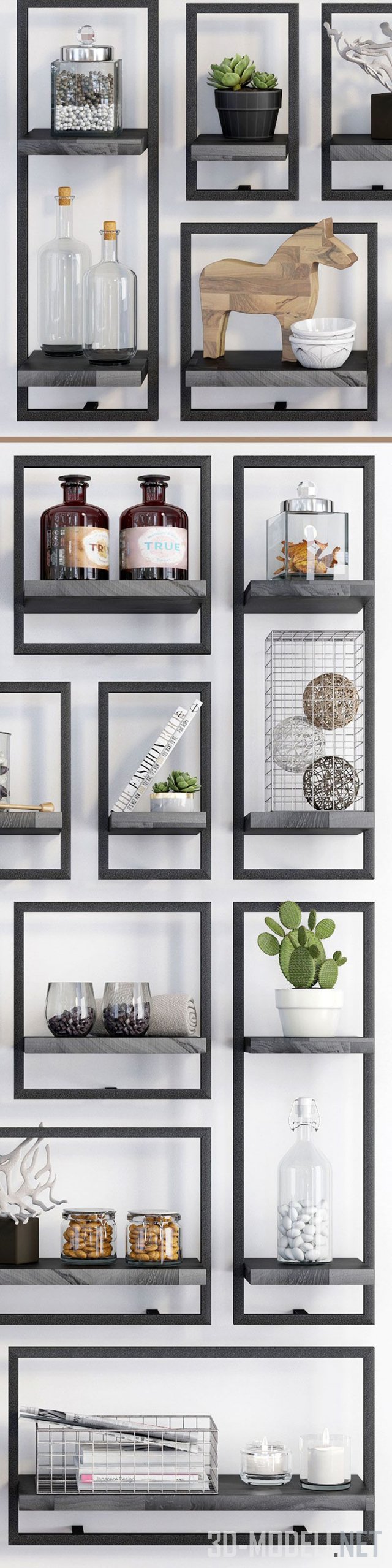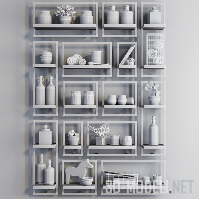 Система хранения, представляет собой настенную полку из новой коллекции бренда d-Bodhi Shelfmate, состоящую из множества отдельных элементов. Дизайн Shelfmate сочетает в себе жесткость металла, из которого изготовлена опорная рама, и мягкость дерева массива тропических тиков. На полках расположено множество различных предметов. Общий размер композиции: 130 х 190 х 25 см. Размеры элементов: