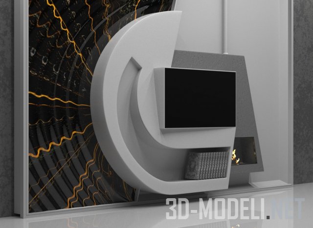 Декоративный комплект для гостиной в современном стиле. В композиции: телевизионная панель, небольшой трапециевидный камин, фигурная ниша для книг и декоративная панель на фоне с абстрактным принтом в виде кругов на воде в черно-оранжевых тонах. Трехмерные элементы ТВ-стенки гармонично соединены в геометрическую композицию.