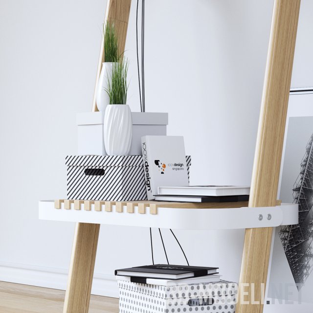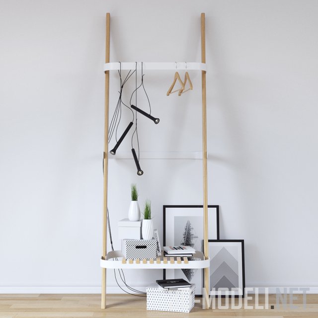 Лаконичная современная вешалка Pual от дизайнера Hyunjoo Lee. Аксессуар представляет собой две вертикальные планки из светлого дерева с белыми узкими перекладинами и небольшой полочкой внизу. На полочке и под ней стоят коробки и белые вазочки с зелеными растениями.