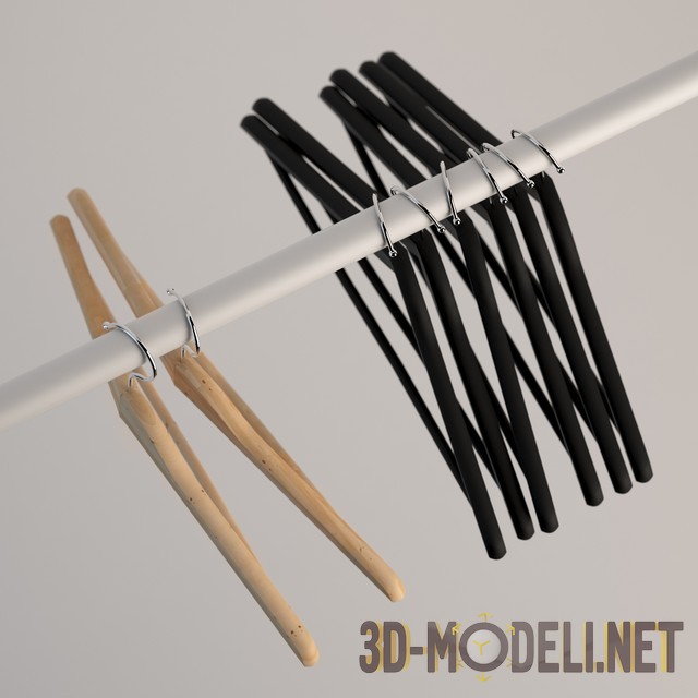 3d-модель набора вешалок для одежды. Аксессуар, без которого не обойтись ни в одном гардеробе, этот набор состоит из двух деревянных и шести черных вешалок. Текстуры в архиве.
