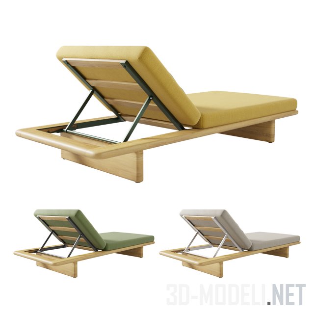 Шезлонг на деревянной основе, модель от торговой марки Kettal. Размеры шезлонга: 203 х 85 х 77 см. В комплекте 3 модели в вариантах отделки:
