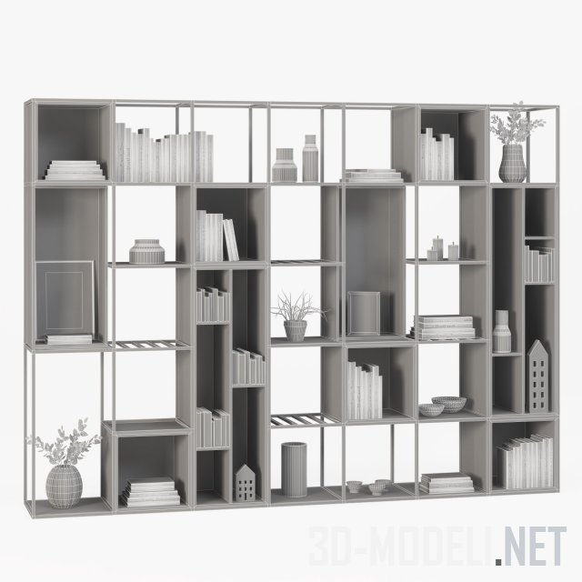 Современный стальной стеллаж для интерьера в стиле лофт или минимализм. Основная конструкция стального цвета хорошо сочетается с некоторыми деревянными полками внутри стеллажа. На полках размещены книги, вазы с листьями и другие декоративные предметы.