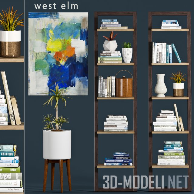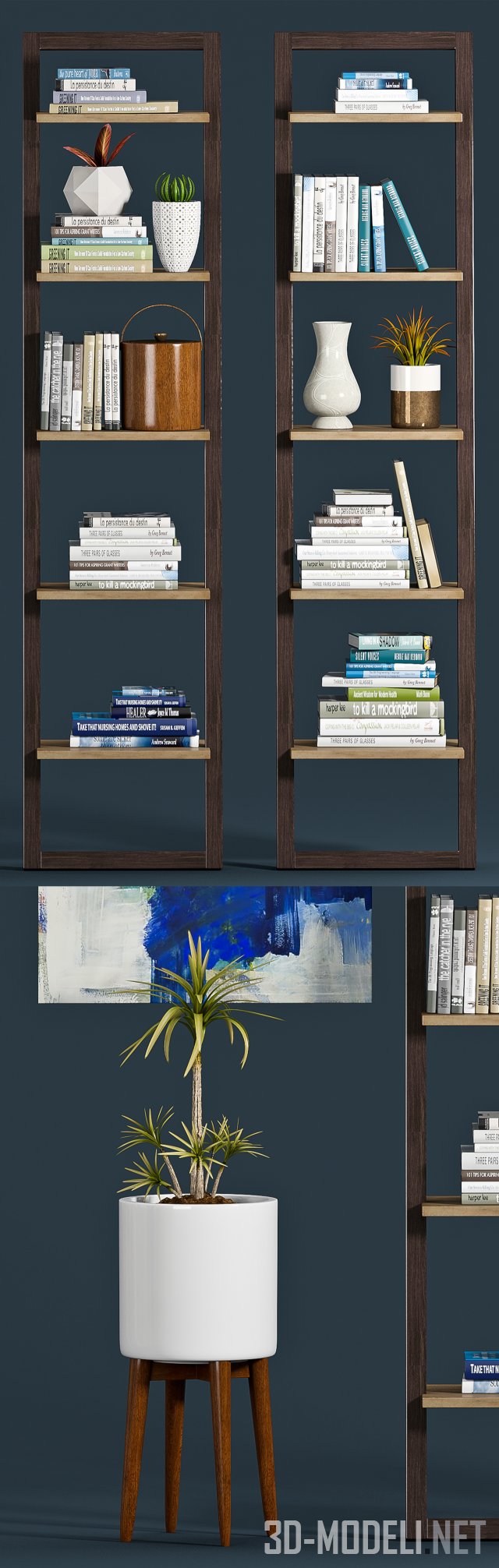 Узкий лестничный стеллаж Narrow от бренда West elm, Сша. В длинной прямоугольной коричневой раме вставлены пять полок из светлого дерева. На полках находятся книги, вазы и цветы в горшочках.