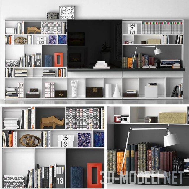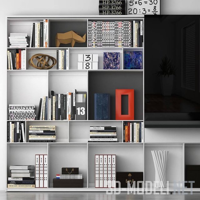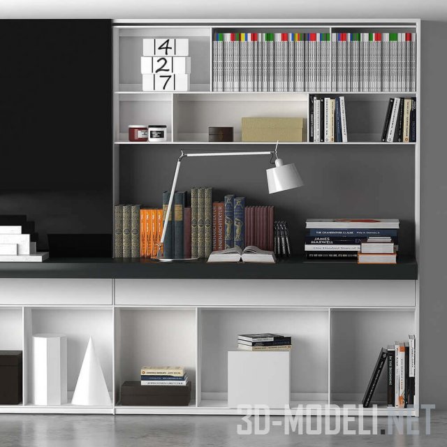 Красивый современный стеллаж белого цвета, серия MAXALTO 4 производства B&B Italia. На полках стеллажа стоит множество декоративных предметов: белая настольная лампа, деревянная фигурка носорога, рамки, банки, коробки, деловые папки и книги.