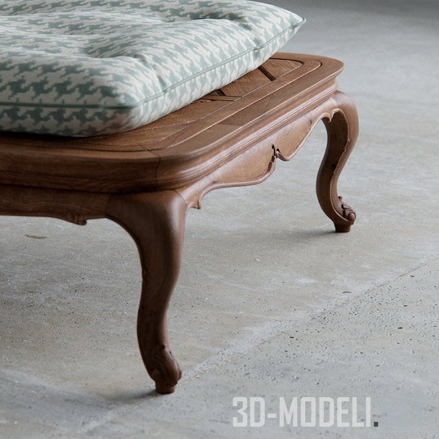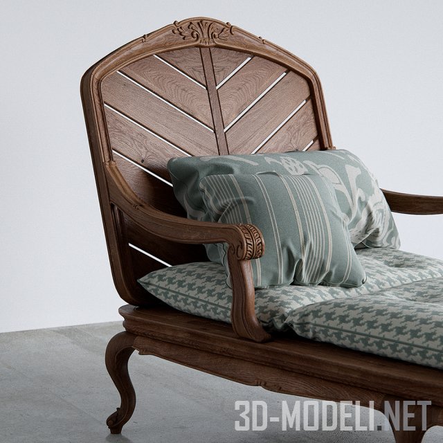 Красивый деревянный шезлонг Art.2160 Chelini в классическом стиле. Шезлонг имеет гнутые резные ножки, высокую спинку с резной инкрустацией и резные подлокотники. На шезлонге лежит матрас и подушки с рисунком. Размеры шезлонга: W.96 L.212 H.111