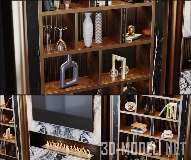 Современная стенка для телевизора с задней частью из белого и черного мрамора. По обеим сторонам от плазмы стоят деревянные стеллажи с множеством полочек. Полки уставлены разнообразными декоративными предметами. Под плазмой длинный узкий камин с горящим пламенем. Габаритные размеры: W 6030 x H 4360 x D 360 мм.