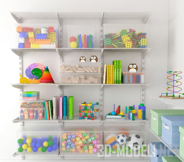 Система хранения Elfa для детской комнаты. На металлических направляющих закреплены легкие металлические полки. На полках лежат разнообразные детские игрушки, книжки и пр. Внизу в полупрозрачных ящиках насыпаны кубики, цветные шарики и лежат мячи. На полках, прикрепленных к другой стене, стоят разноцветные плетеные корзинки с крышками.