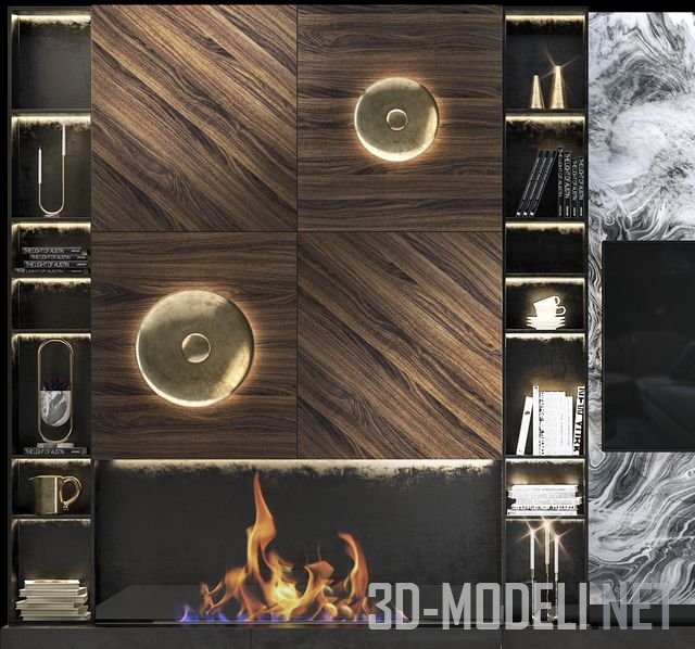 Современная мебельная группа для зоны TV, с камином в комплекте. Над камином деревянные панели, на их фоне отлично смотрятся круглые золотистые элементы с подсветкой. С обеих сторон панелей расположены открытые подсвеченные полки с декором. Справа большая панель под мрамор, на которой висит телевизор. Размеры мебели: 400 х 290 х 42 см.