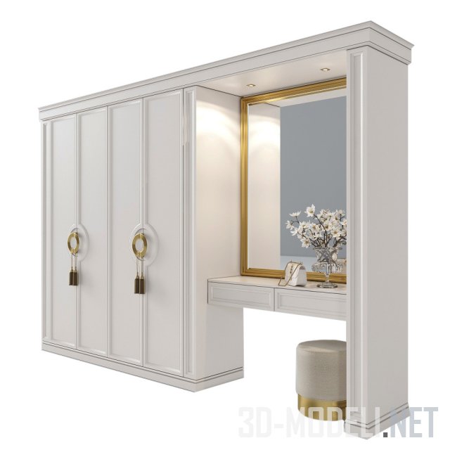 Элегантная мебель для прихожей в классическом стиле. Белый цвет отлично сочетается с золотой отделкой на ручках шкафа, зеркале и пуфе. Букет цветов, кисти на ручках и другие детали придают мебели декоративность и изысканность.