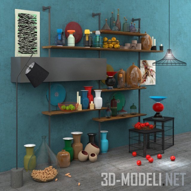 Набор аксессуаров для современного интерьера. В основе стеллаж Cattelan Airport, со множеством элементов, а также светильники Cattelan Karibu и Nowodvorski Wire Black. В комплекте также присутствует картины Original Woodcut Print, Interwoven, John Richard Splat Original Abstract Painting, Barber Osgerby beautiful cannisters, стеклянные тарелки Venini Quattro Stagioni, набор бутылок Vetrovero Smoky Jewel Bottles и Venini Bolle, чаша BoConcept Soft Line и Net с яблоками, набор коробок BoConcept, коллекция Living, вазы Smania Bubble и Smania Ares, набор ваз Venini Opalini, подсвечники, декор Venini Yemen, Venini Oman, набор Muuto Corky-Glasses + Corky-Carafe, корзины CreativeHome 525 х 420 х 525(h), 480 х 420 х 405(h), набор горшков BoConcept Rolling.