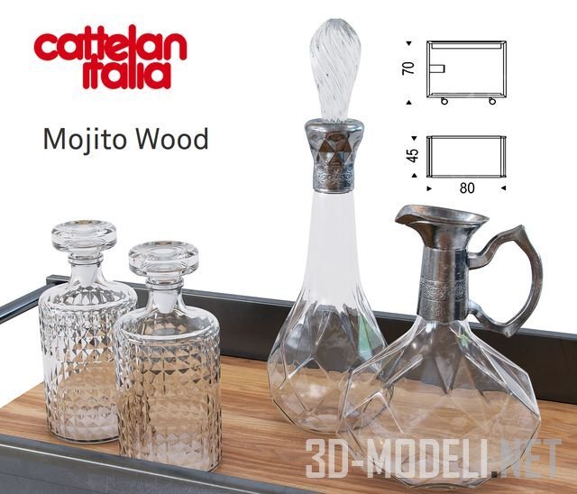 Современная сервировочная тележка Mojito wood от Cattelan Italia. Дизайн Marino Burba (2014 г.) Графитовый цвет металлических элементов тележки гармонирует с массивом дерева на полках. Габарит тележки: 70 х 45 х 80 см. Тележка нагружена посудой (белыми тарелками, хрустальными графинами, стаканами), бутылками с алкоголем. На ручке тележки серое полотенце.