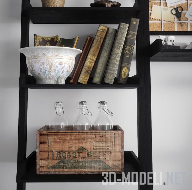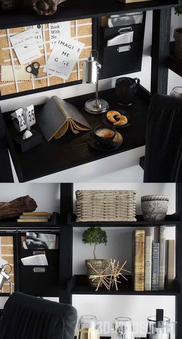 Современный стеллаж для рабочего места, мебель черного цвета. На полках стеллажа стоят небольшие горшочки с домашними растениями и разнообразный декор: книги, бутылки в коробке, бежевая сумка, карандаши и пр. В сцене присутствует мягкий стул черного цвета