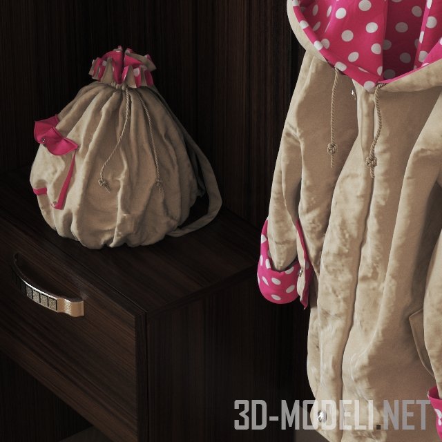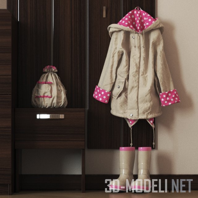 Мебельный гарнитур в прихожую с тумбами, вешалкой на шесть крючков и прямоугольным зеркалом. Отделка поверхностей - темный орех. Детская курточка, резиновые сапожки и небольшой рюкзачок гармонично размещены в прихожей. Бежевый и розовый цвет в белый горошек на одежде и аксессуарах хорошо сочетается с темной отделкой мебели.
