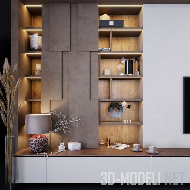 Большая ТВ-зона в современном стиле с аксессуарами и букетами из сухих трав. Габарит стенки: 700х304х71,5см. Глубокая тумба с выдвижными ящиками растянулась на всю длину мебели. Над ней смонтирована система открытых и закрытых полок с теплой LED-подсветкой. Фасады выдвижных ящиков и центральные панели, на которых висит телевизор - белые. Секции открытых полок закрываются раздвижными панелями из плиты с коричневато-серой текстурой камня. Задняя стенка полок - плиты с текстурой дуба. Теплая подсветка и текстура дерева создают приятный золотистый контраст с передним планом. На полках и тумбе размещены вазы с сухими травами, книги, сувениры, подсвечники.