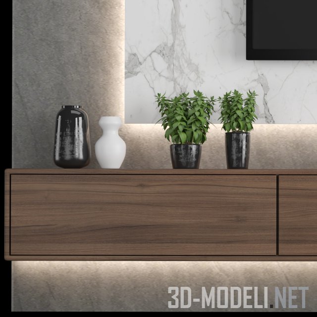 Для интерьера гостиной, формирования в ней зоны просмотра телевизора подойдет набор мебели, выполненный в современном стиле. Панель за телевизором сделана из светлого мрамора, с подсветкой. Задняя стенка оформлена еще одной каменной панелью и рейками. Тумба навесная, фасады из дерева поддерживают тему реек. Размер мебели: Ш 3100 x В 2600 x Г 490 мм.