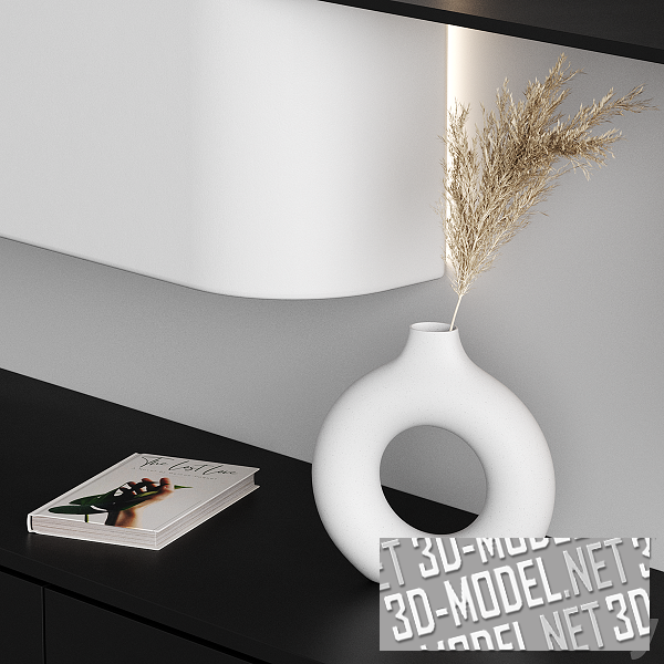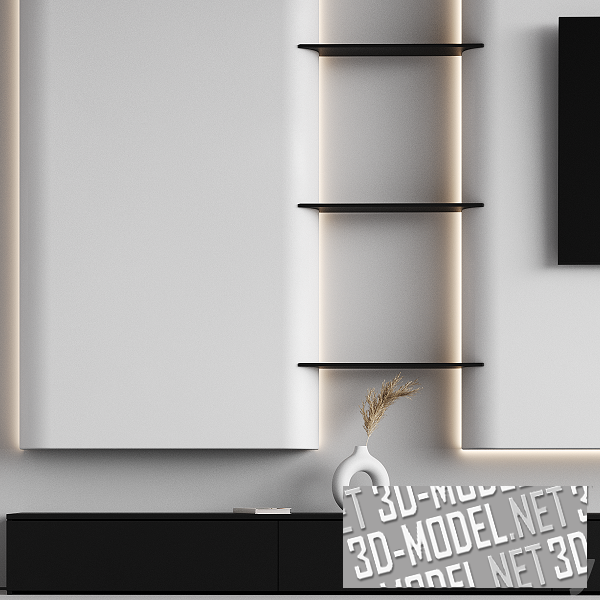 ТВ-тумба, стена с декором и аксессуары в черно-белом минимализме. Над лаконичной черной узкой и длинной ТВ-тумбой с белой вазой, сухим тростником, квадратным рельефным панно в деревянной рамке и книгой, разместилась большая стеновая композиция из двух крупных белых выступающих прямоугольников с подсветкой по периметрам и черными «скобами» стеклянных полок. Боковые, вертикальные кромки прямоугольников скруглены к стене. Черным «квадратом Малевича» на большем прямоугольнике смотрится ТВ-панель. Габарит композиции: 285х440см.