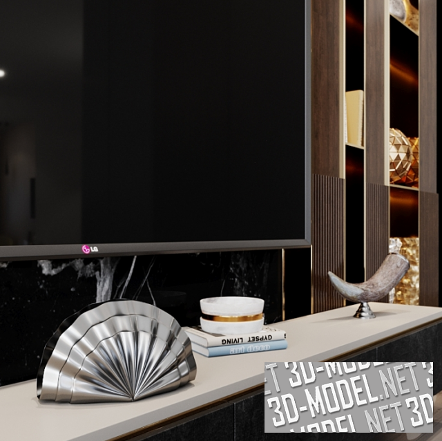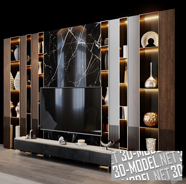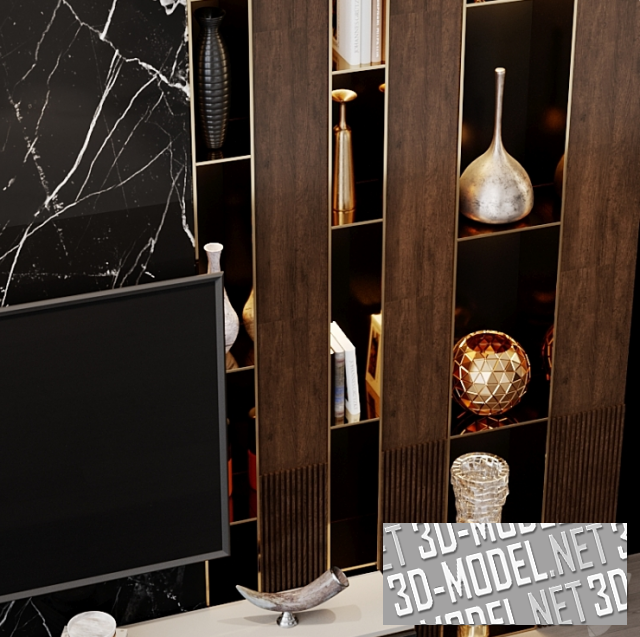 Черная низкая тумба, ТВ-панель, стена из черного мрамора с белыми прожилками и системы открытых полок с аксессуарами по бокам. Вертикальные широкие вставки из темного дерева разделяют открытые полки с подсветками. На полках: керамика, посуда, сувениры. Столешница на черной тумбе - белая. На ней: металлическая салфетница, сувенирный рог, книги, подставка для книг. Габарит стенки: 490х320х66см.