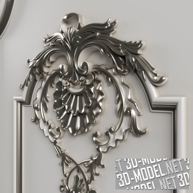 Белый мебельный фасад с небольшой пуговкой-ручкой и серебристым барельефом в барочном стиле. Барельеф в виде декоративной рамки с центральным мотивом.