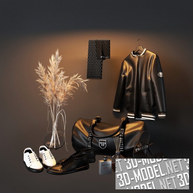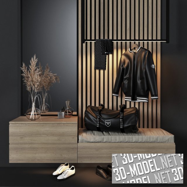 Современная мебельная группа с аксессуарами и декором для прихожей. Корпуса мебельных блоков изготовлены из плит с текстурой древесины дуба. Левая часть посвящена большому зеркалу и тумбой под ним, с парой выдвижных ящиков. На тумбе - стеклянная ваза с пампасной травой, аромо-диффузор и духи. Правая часть мебельной группы - вешалка с подсветкой, вмонтированной в черную горизонтальную штангу и мягким матрасиком на низкой тумбе для обуви. На вешалке - черный шарф и черный бомбер на деревянных плечиках. На матрасике - черная сумка. Три пары обуви (сникерсы и шлепки) разместились на полу. Задняя стенка вешалки отделана вертикальными деревянными рейками в цвет мебели. Габарит мебели: 220х270см.