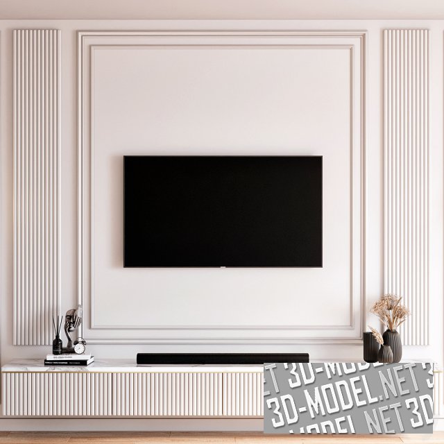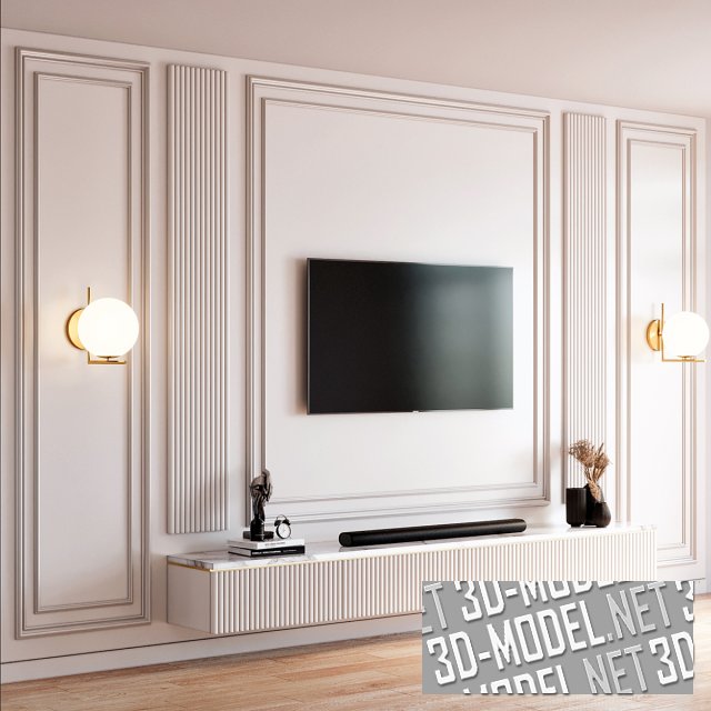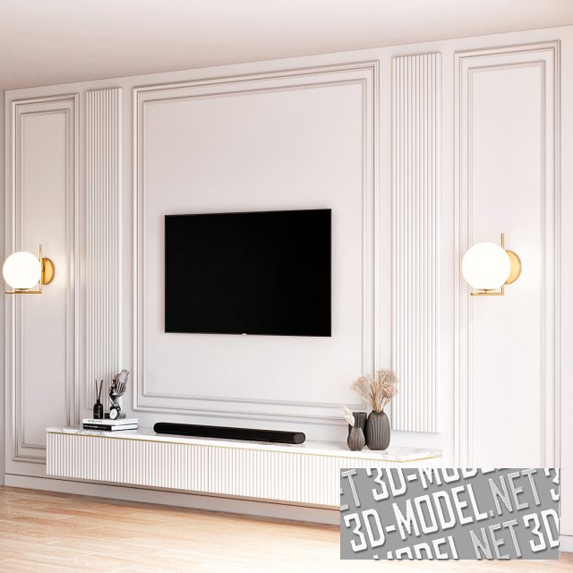 Окрашенная в нежный оттенок симметрично оформленная TV-стена. Отлично подойдет для интерьера в стиле нео-классика. Шаробразные настенные светильники гармонично вписываются в общую концепцию оформления. Размеры мебели: 430 х 40 х 300 см.