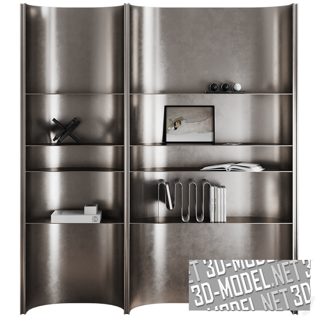 Оригинальный криволинейный асимметричный стеллаж с декором Glowe. Две секции стеллажа (шириной 80 и 130см) выполнены из листового металла. Выгнутые по вертикали, они в разрезе образуют «С». В изгибах этих модулей размещены четыре металлические полки. Поверхность металла гладкая, темно-серебристая, с пятнами.