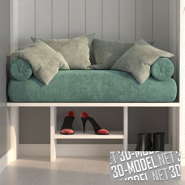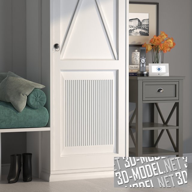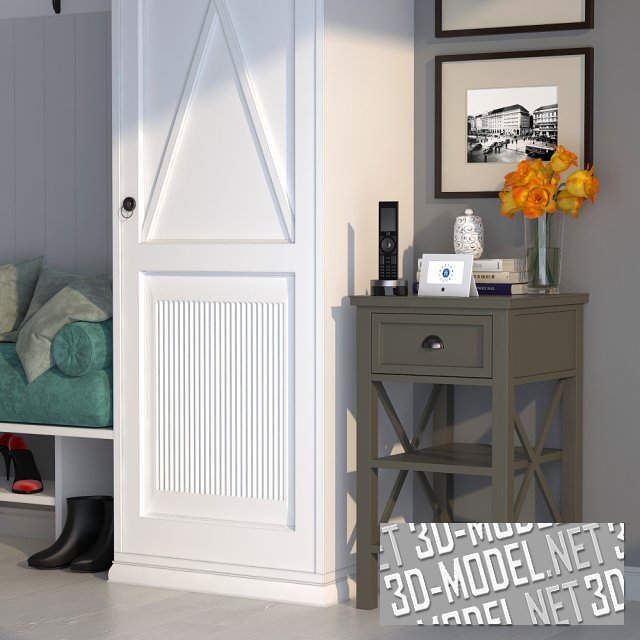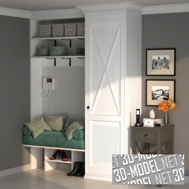 Шкаф, столик-тумба, полки с коробки, обувь, домофон, картины и другие декоративные аксессуары составляют отличный комплект для наполнения пространства прихожей. Трехмерная модель выполнена качественно, реалистично, с особым вниманием к деталям. Для использования в различных проектах. Настроенные материалы Vray, Corona и текстуры собраны в архиве.