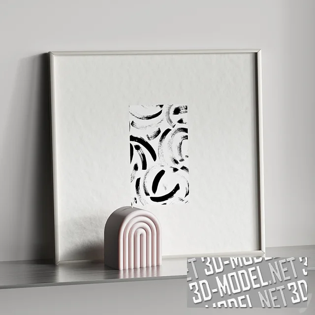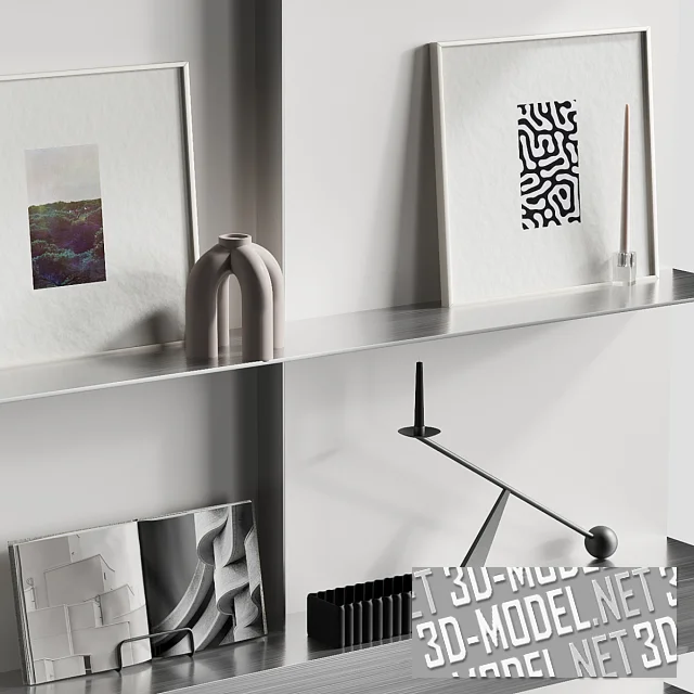 Современный минималистичный стеллаж с полками, консольным столиком (с текстурой черного дерева) и декором на полках. Задняя стенка стеллажа - белая плоскость. На ней закреплены полки и короб стола. В наборе декора: настольная керамическая лампа Fungus/SAND/101 COPENHAGEN (дизайнеры: Kristian Sofus Hansen & Tommy Hyldahl), открытая книга на подставке, черный подсвечник Interconnect, арочная свеча, шкатулка DENSTON BOX IN DARK OLIVE, стеклянный кубический подсвечник (4х4х6см), три квадратные узкие белые фоторамки с широкими текстурированными белыми паспарту и небольшими абстрактными принтами.