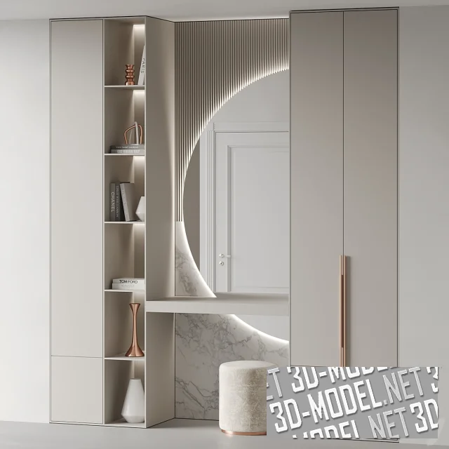 Современная мебельная композиция для интерьера прихожей. С одной стороны шкаф для хранения гардероба, с другой – полки для книг и других декоративных аксессуаров, по центру – стол, зеркало и пуф. Габаритные размеры мебельной стенки: 2700 х 2400 х 500 мм.